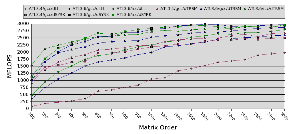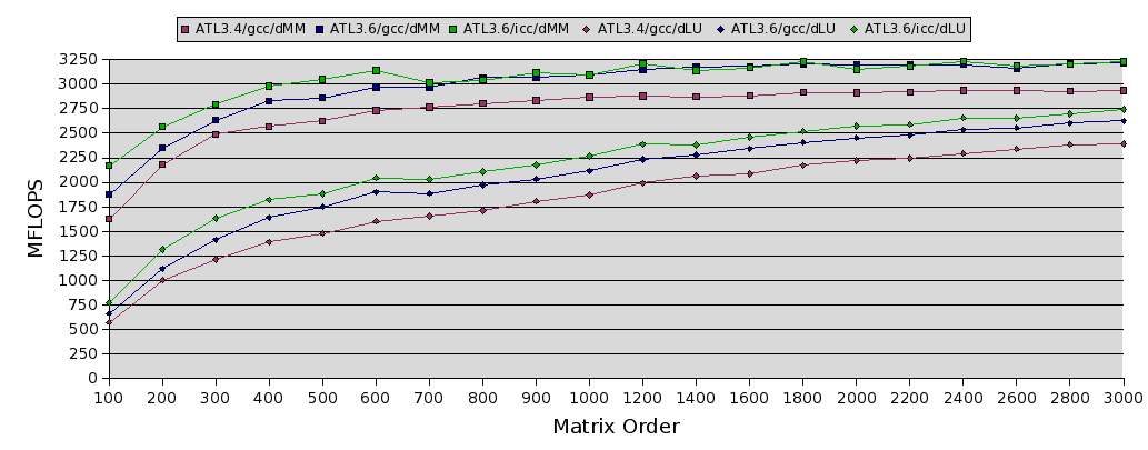 OK, there are several interesting things on this graph. We see that 3.6.0 is faster than the old release regardless of your compiler. As far as GEMM is concerned, gcc and icc have the same asymptotic performance. This is as expected: they are both using the same kernel, and that kernel is actually compiled by gcc even under ATLAS/icc. Where icc does it's work is in all the cleanup cases, and the other BLAS, where it simply wipes the floor with gcc on taking simple code and using all the IA64's funky architectural features. This translates into a faster LU, even for very large problems where the GEMMs have become indistinguishable.