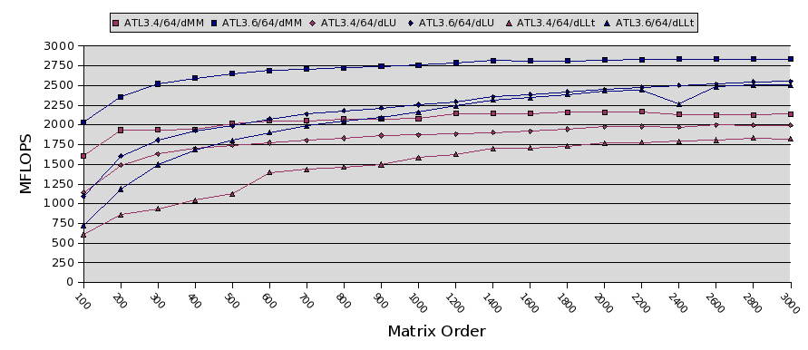 The gap is even larger for single precision. There are a couple of reasons for the 64 bit performance lead. The first won't go away: under 64-bit mode, you have access to double the number of integer and floating point registers. I would guess that somewhere between one eighth and one quarter of this gap is due to this. The rest of the gap is that I have not applied all the optimizations tricks to the 32 bit code that I did to the 64 bit. Since I am in a perpetual shortage of time, I simply didn't do much special tuning for the 32 bit mode. In fact, it is using a kernel I wrote for the Pentium 4.